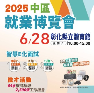 除了參與台北市就業博覽會外,勞動部中彰投分署亦於彰化縣立體育館辦理2025中區就業博覽會,共有64家廠商參加並釋出2,500個職缺,彰化所提供「清洗火車作業員」、「隨車清掃作業員」、「航空公司貴賓室餐廚人員」、「辦公大樓清潔人員」、「清洗飛機作業員」等5項,吸引數十位民眾至本所攤位面試,目前正逐步篩選人才以媒合合適人選。